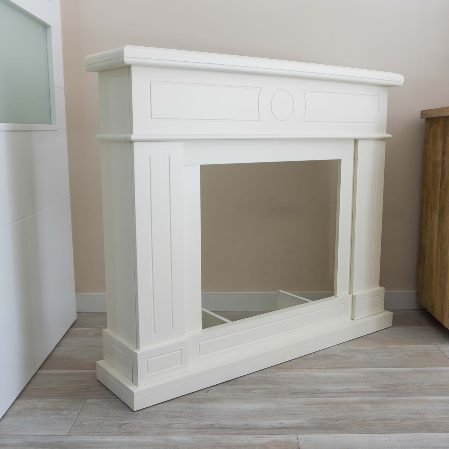 Progettato e realizzato per un facile montaggio, non sono necessari strumenti extra, questo caminetto completo bianco crema ha un design che gli permette di essere posizionato in qualsiasi stanza, ufficio o lacale anche di rappresentanza.