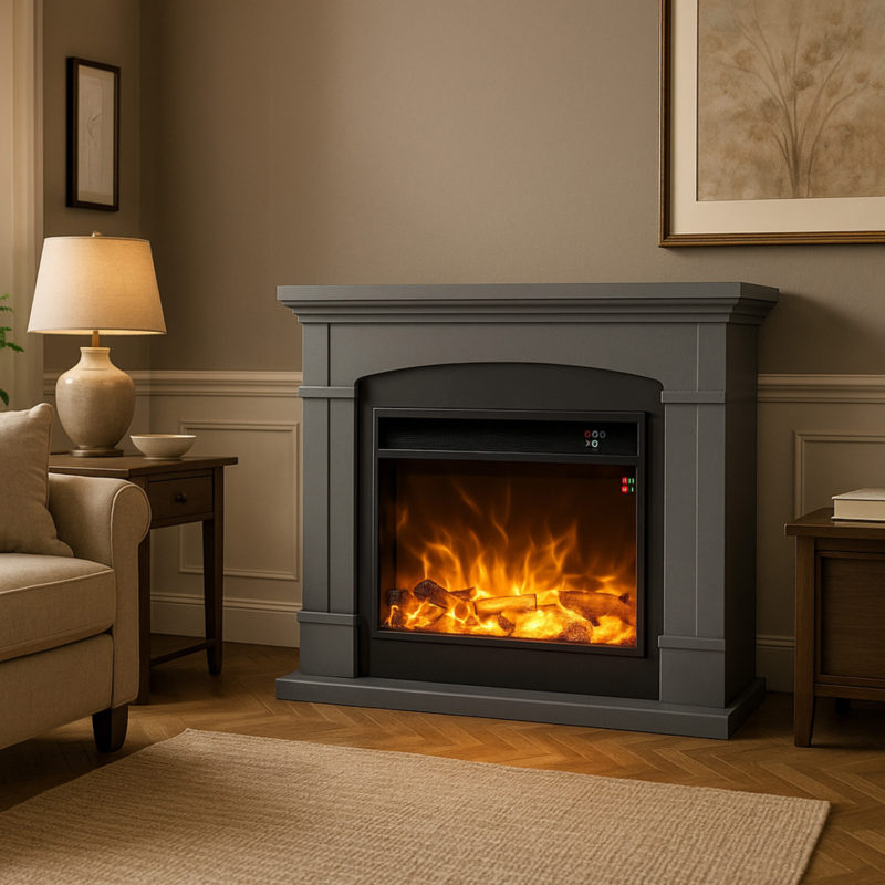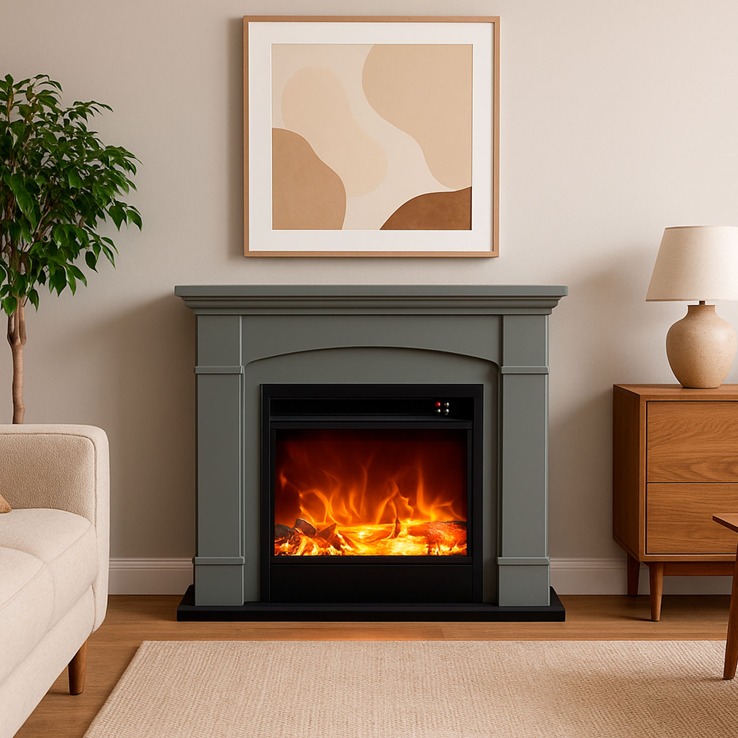 Caminetto elettrico da pavimento per tutte le stagioni, per uso domestico o commerciale. La mensola del camino elettrico presenta una finitura grigio scuro multistrato, nonché un delicato centro ad arco, colonne lisce e un telaio centrale con bordi arrotondati. La luce integrata a Led è molto realistica. La profondità di soli 25 cm lo rende poco ingombrante, perfetto per qualsiasi ambiente.