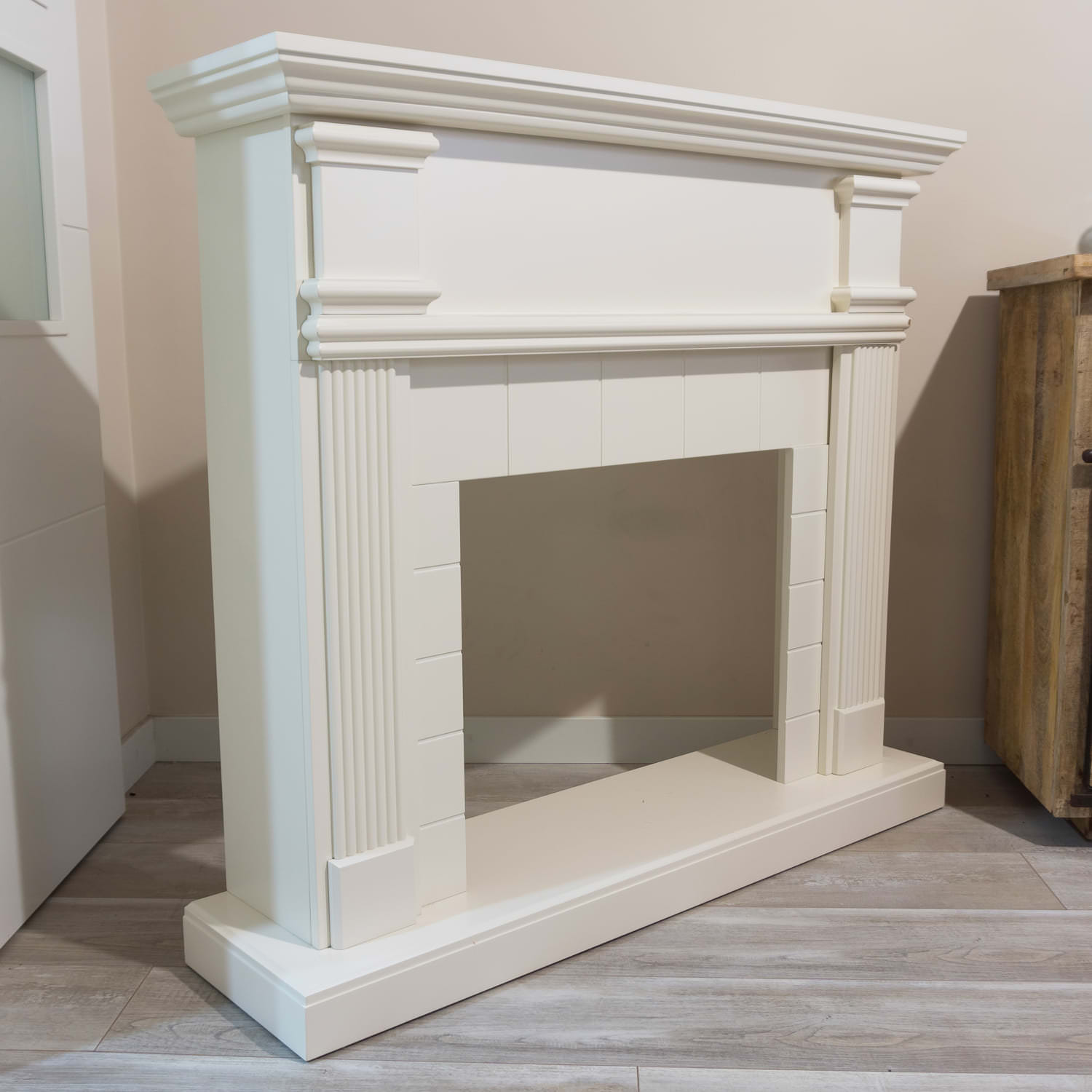 Cornice per Caminetto da pavimento modello Caldera, colore bianco crema. Cornice in stile classico modello Caldera per caminetto elettrico.
