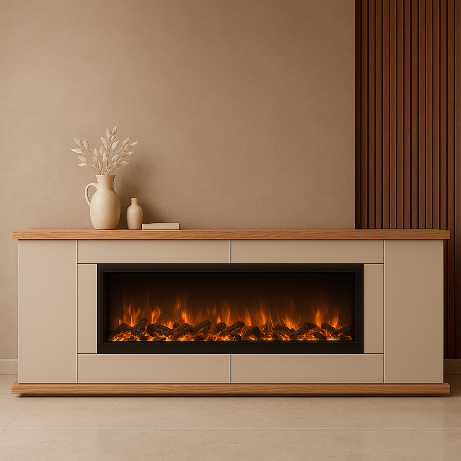 Dettagli in Rovere Nodato: Il piano e gli accenti in rovere nodato conferiscono consolle con camino elettrico un aspetto naturale e una texture ricca, aggiungendo un tocco di calore al design moderno.